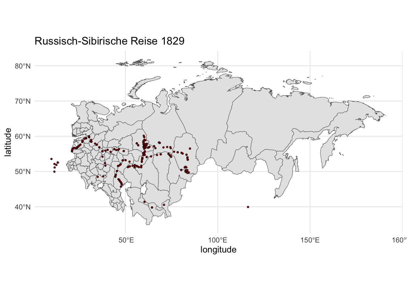 ggtitle("Russisch-Sibirische Reise 1829") ## Warning in geom_point(data = site_data, aes(x = longitude, y = latitude, : Ignoring unknown aesthetics: text