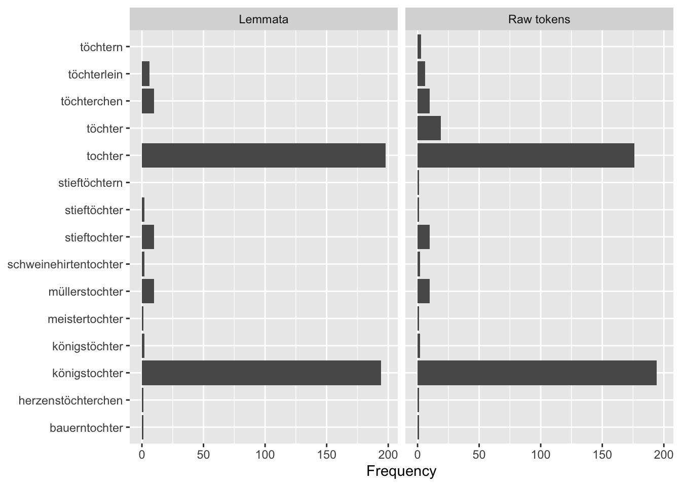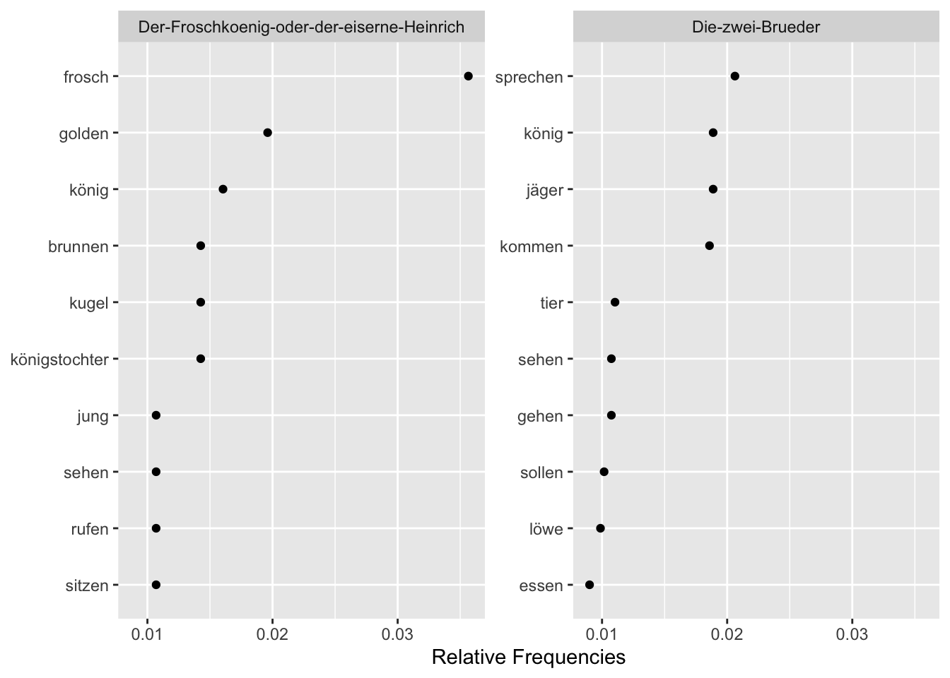 In den nächsten beiden Wochen werden wir ein Korpus von Kinder- und Hausmärchen der Gebrüder Grimm aus dem Jahr 1857 im Hinblick auf die Darstellung verschiedener Märchencharaktere untersuchen. Dabei werden wir verschiedene Analysemethoden kennenlernen und kritisch beleuchten, inwieweit diese Methoden uns helfen können, bestimmte Muster in der Beschreibung von Märchencharakteren zu identifizieren. In diesem Kapitel werden wir zunächst Worthäufigkeiten und das gemeinsame Vorkommen verschiedener Wörter unabhängig von der Beziehung der Wörter zueinander betrachten. Wir werden dabei kritisch beleuchten, was die vorgestellten Analysemethoden leisten können und was nicht. Im Kapitel 9 werden wir dann konkreten Fragen nachgehen: Welche Charaktere kommen in den Märchen vor? Mit welchen Adjektiven werden diese beschrieben? Welche Verben werden mit ihnen assoziiert?
