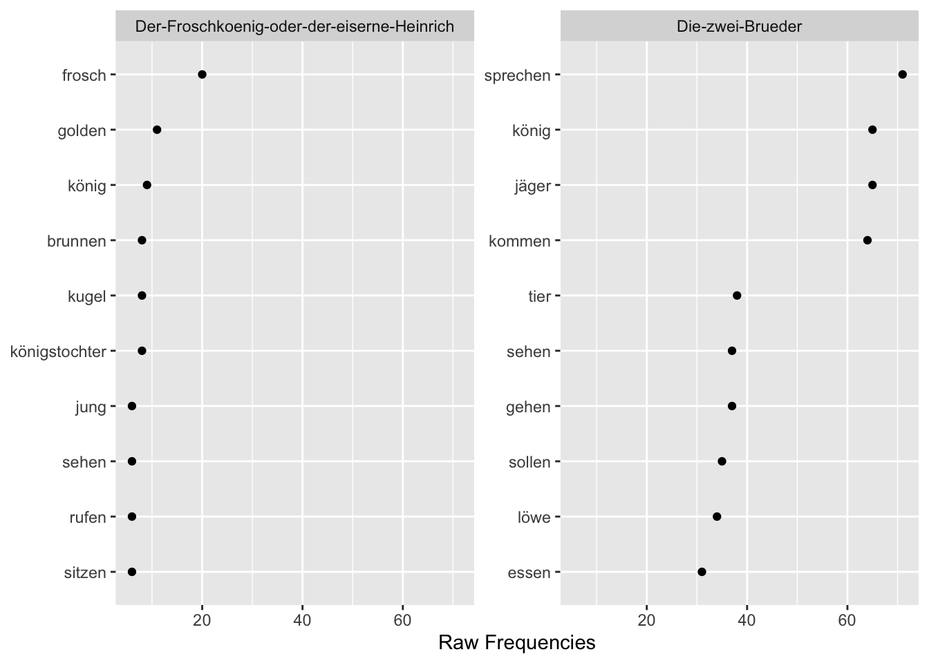 Die gewichtete FCM verwenden wir zuletzt, um den unseren Vergleich der Märchen “Froschkönig” und “Zwei Brüder” aus dem Abschnitt “Kookkurrenzen” zu wiederholen. In dem Abschnitt hatten wir verglichen, welche Wörter in den beiden Märchen am häufigsten zusammen mit unserem Schlüsselwort “königstochter” vorkommen. Dazu verwenden wir den Code aus dem Abschnitt “Kookkurrenzen”. Das Einzige, was wir ändern müssen, ist, die fcm mit unserer Funktion zu gewichten, also z.B. froschkoenig_pmi <- fcm_pmi(froschkoenig_fcm).