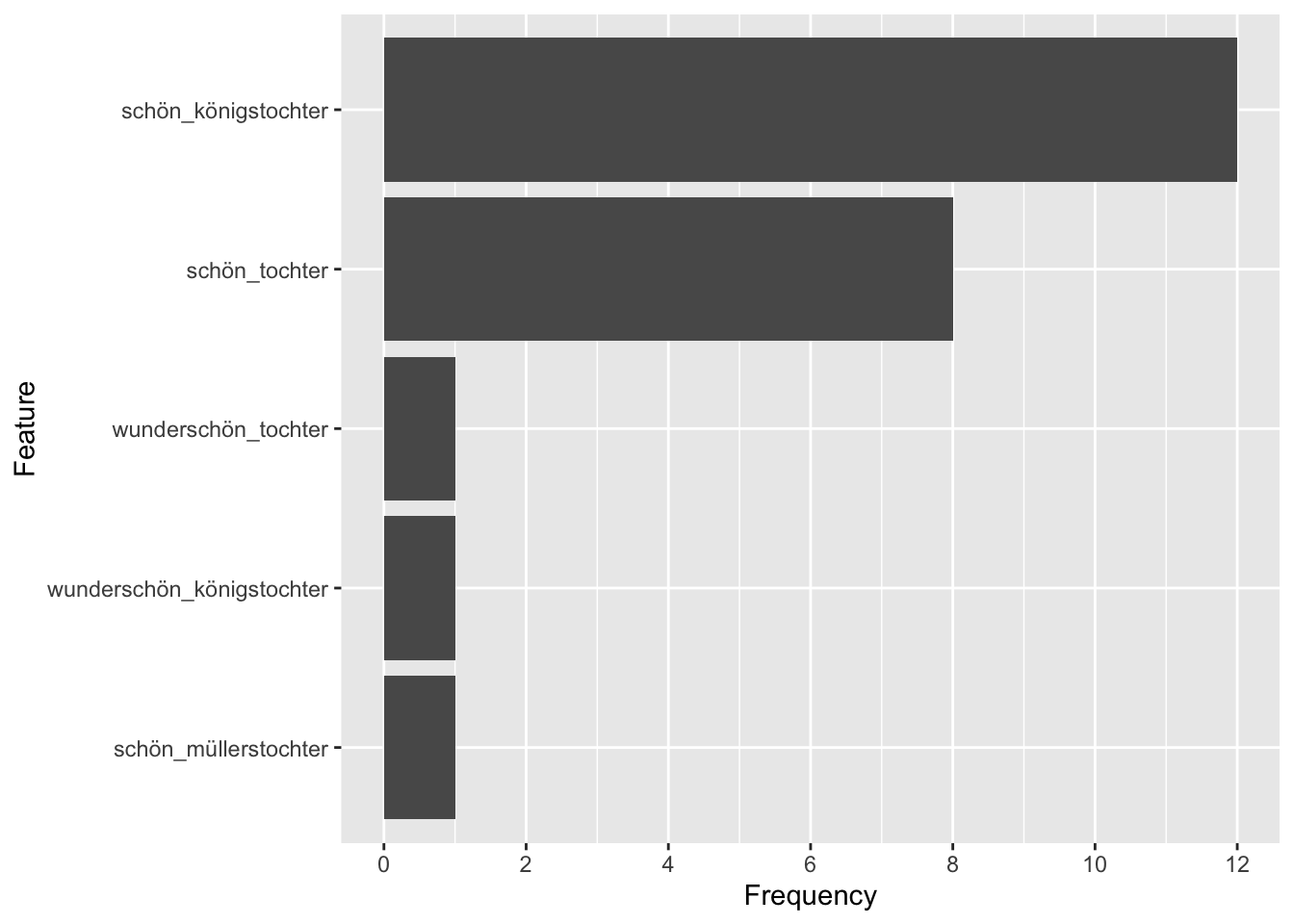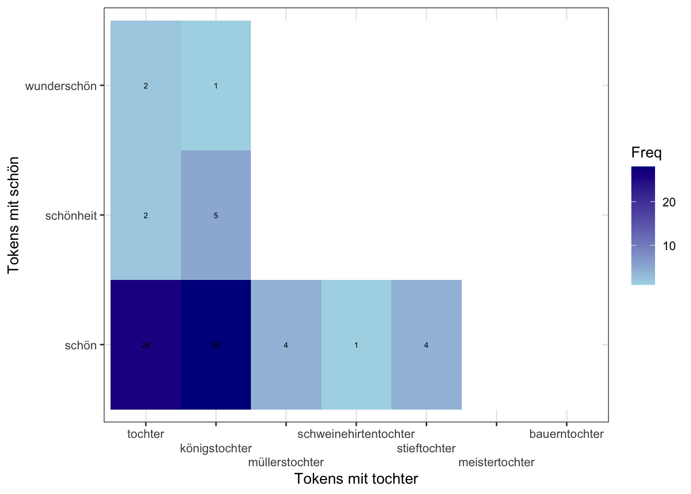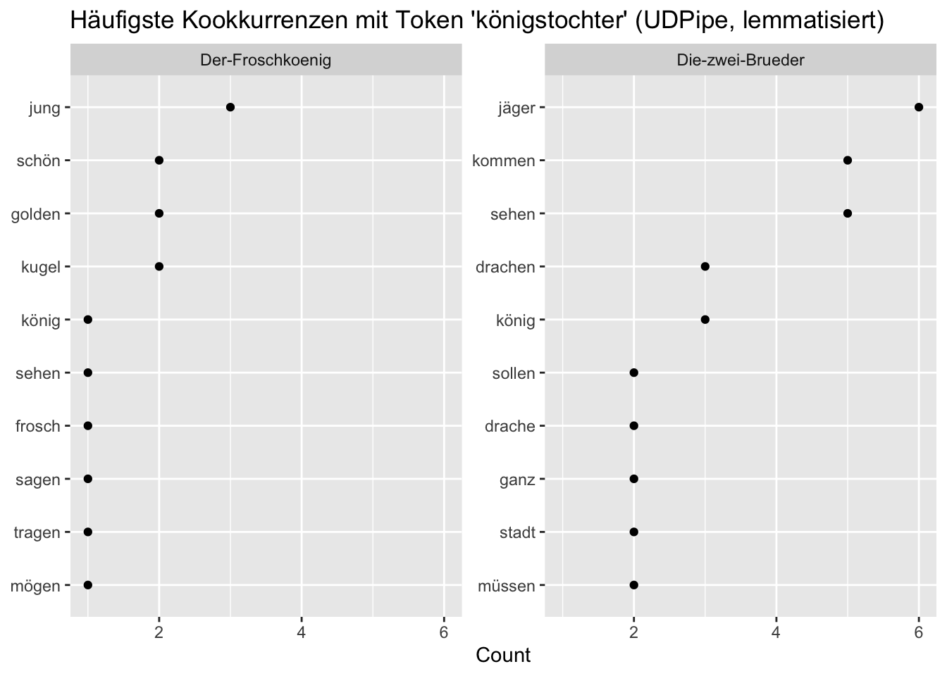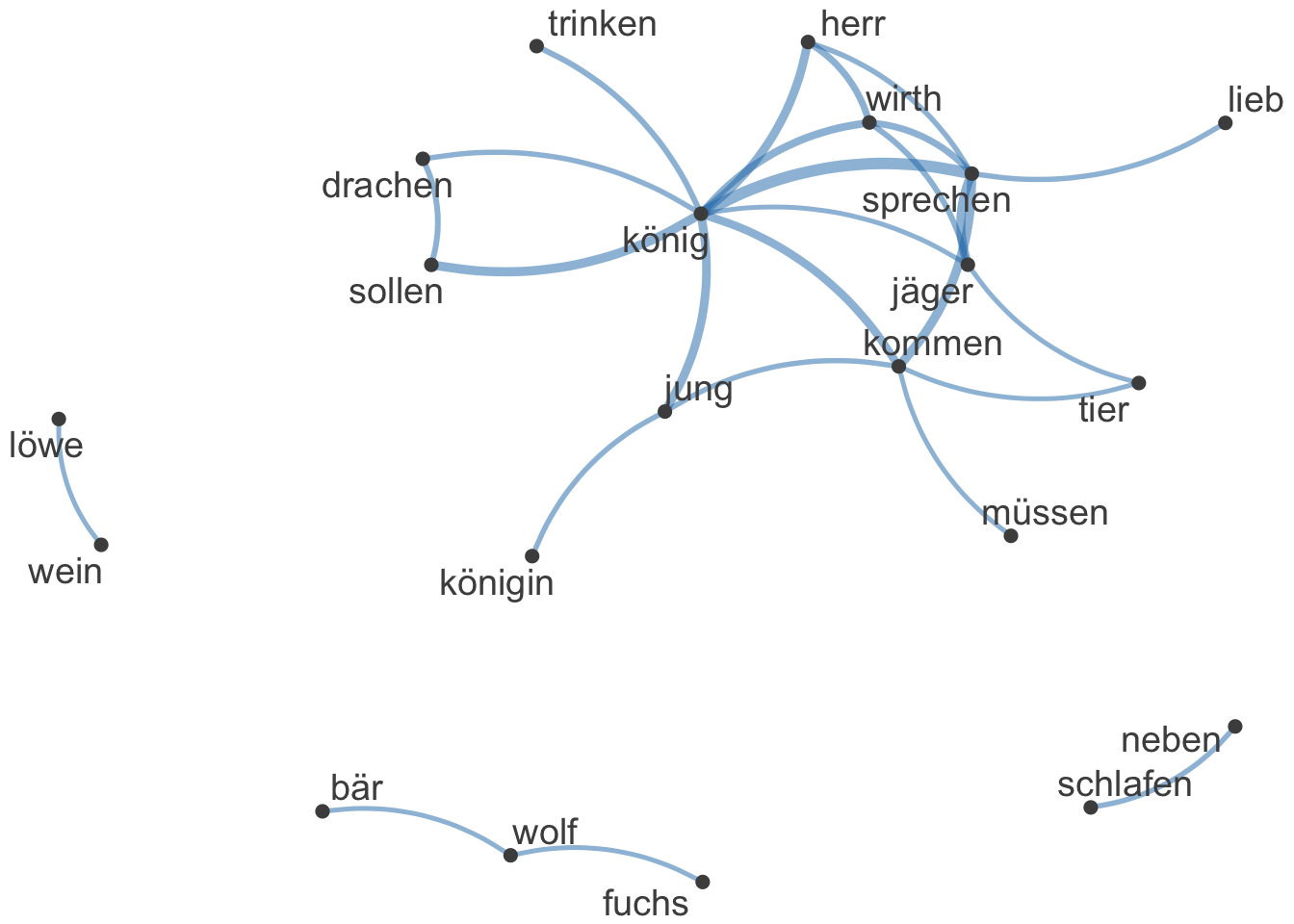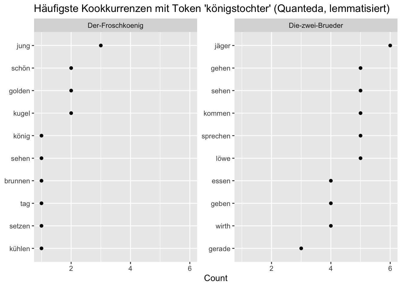 Ganz fertig sind wir mit unserer Märchenanalyse aber noch nicht: Schließlich wissen wir immer noch nicht, ob sich Wörter, die gemeinsam vorkommen, auch aufeinander beziehen. Bisher haben wir unsere Analyse außerdem auf Tochter-Tokens begrenzt. Als nächstes werden wir zwei Methoden kennenlernen, mit denen untersucht werden kann, ob sich zwei Wörter aufeinander beziehen, und wir werden die Analyse auf andere Märchencharaktere ausweiten.