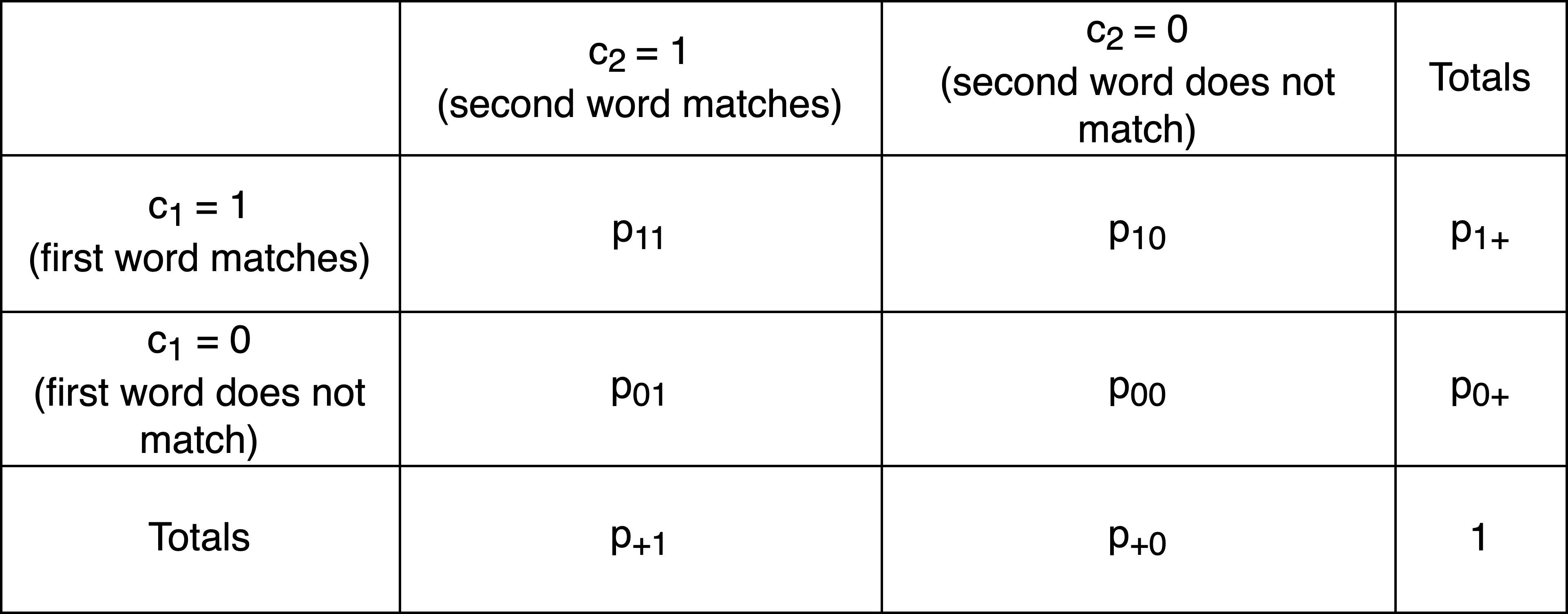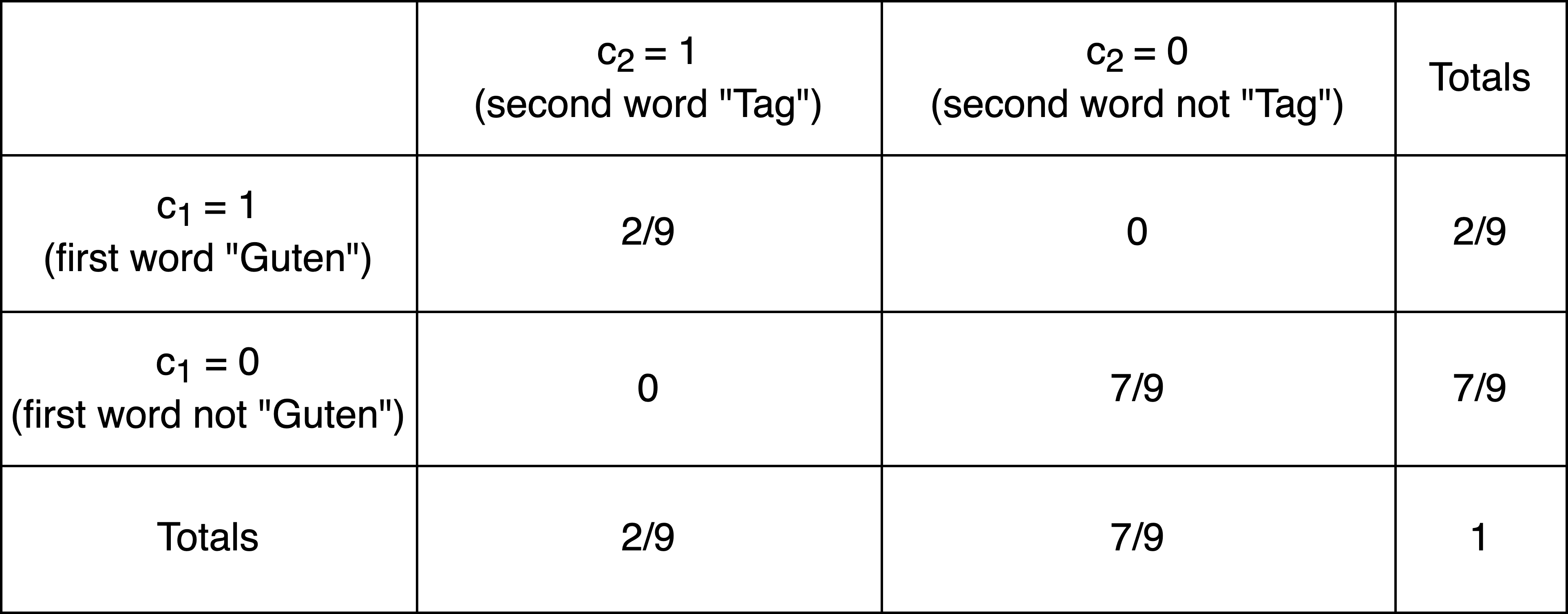 Während \(P(w,c)\) die aus den Daten beobachtete Wahrscheinlichkeit ausdrückt, dass \(w\) und \(c\) gemeinsam vorkommen, drückt \(P(w)*P(c)\) eine theoretische Wahrscheinlichkeit aus: So häufig würden \(w\) und \(c\) gemeinsam auftreten, wenn sie unabhängig voneinander auftreten würden, also wenn das Auftreten von \(w\) keine Information darüber liefert, ob \(c\) auftritt oder nicht (und umgekehrt).
